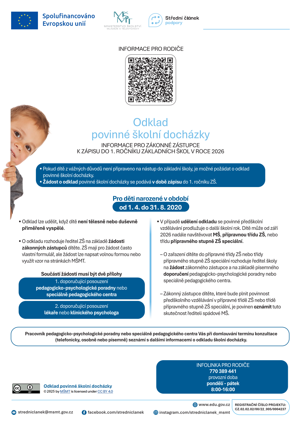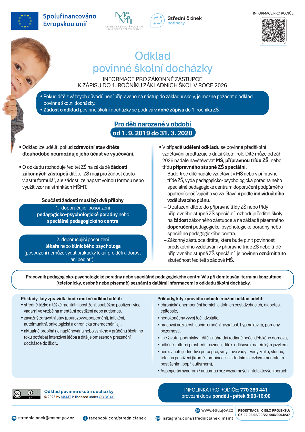 K zápisu jsou povinny se dostavit všechny děti, které do 31. 8. 2026 dovrší 6 let, bez ohledu na to, zda budou rodiče žádat odklad školní docházky.